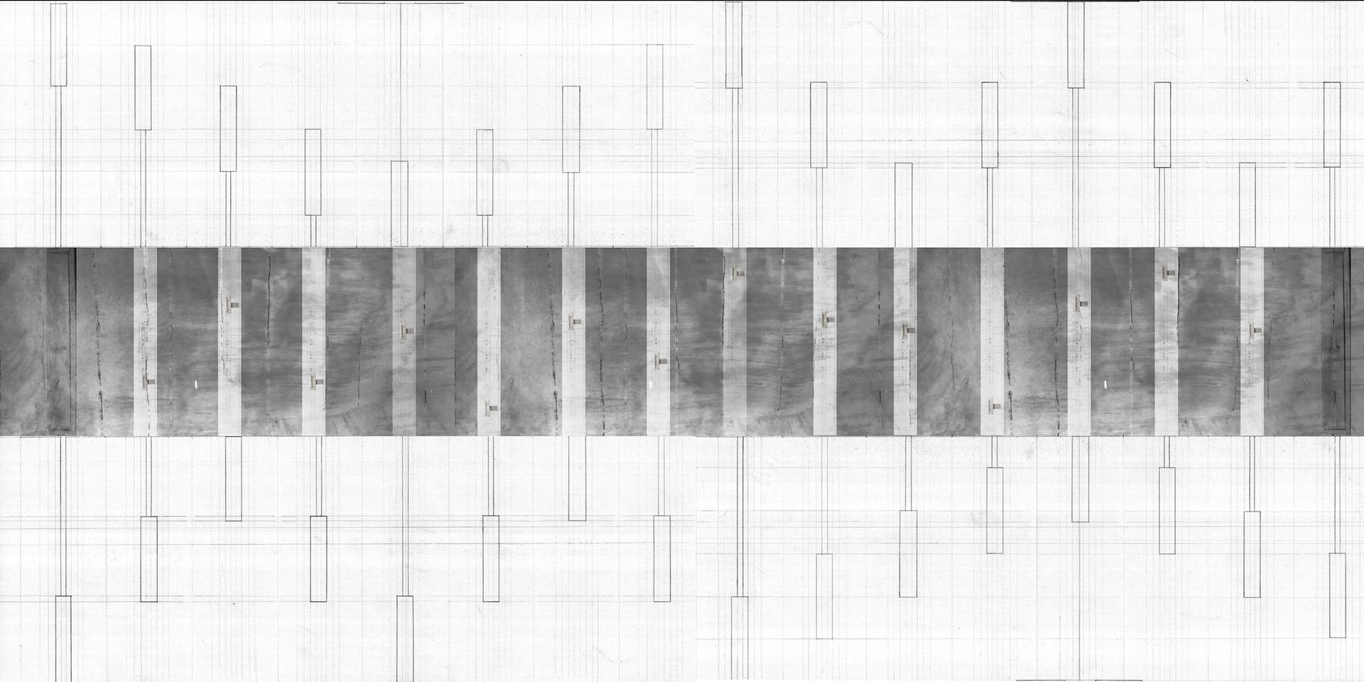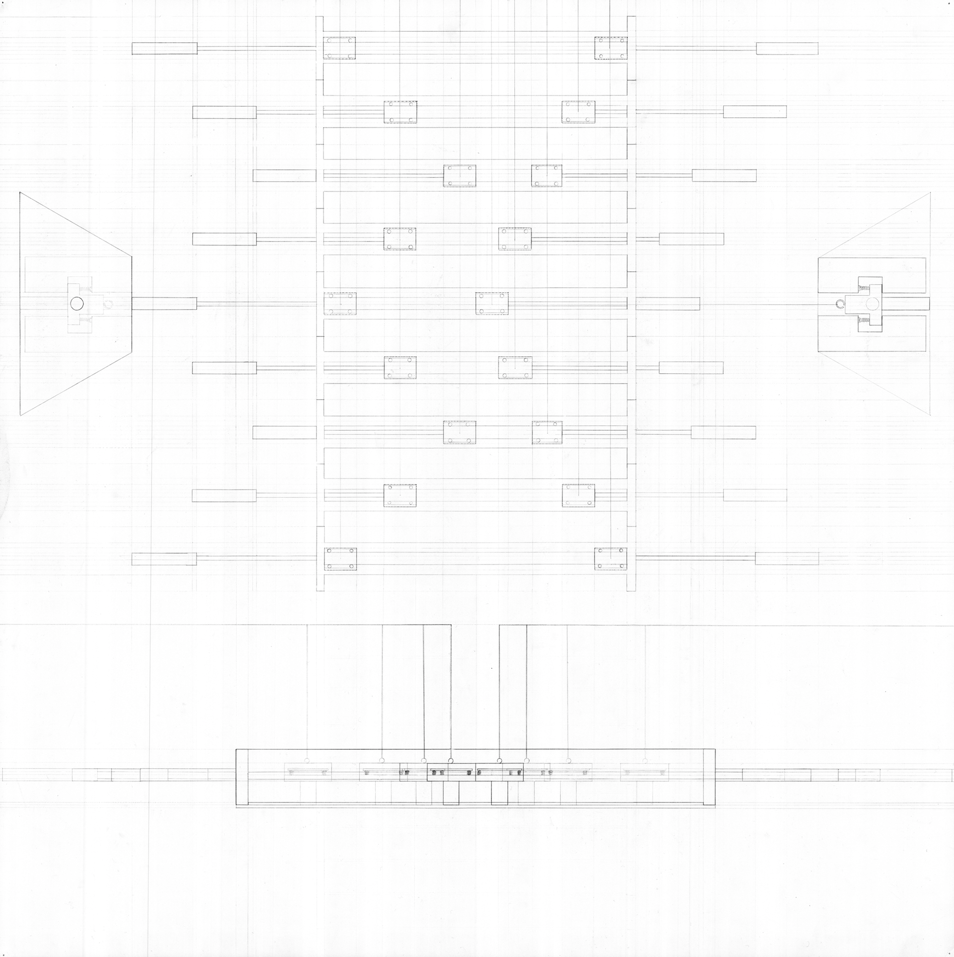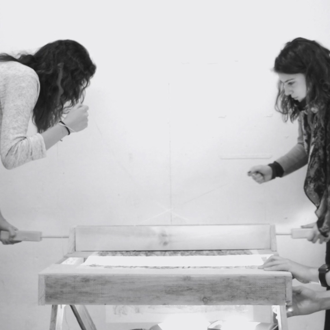 the machine is a table that allows for a previously charcoaled sheet of mylar to run through it while the two users act ono the paper. Inside the machine lie two instruments that have erasing and drawing components attached. each user is able to control the speed of the tool with one hand, and the pressure with which it acts in their other hand. this creates a drawing with a consistent grey background and unique white and black lines throughout.