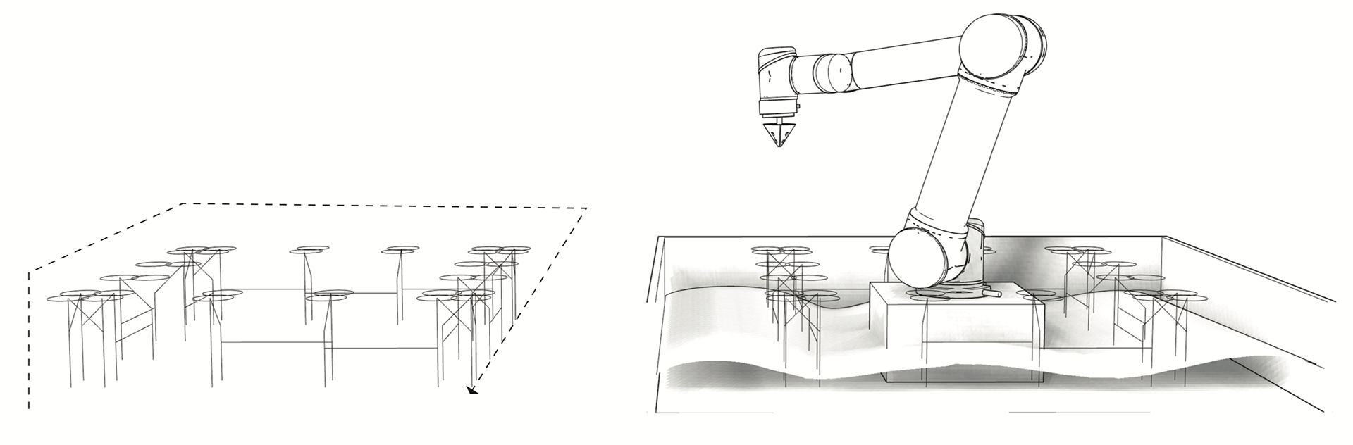 the centerpiece of the workshop was a digitally manipulated “sandbox.” the design process was iterative—we interacted with this self-contained space filled with sand, by making use of hardware and software tools, to reshape it continuously. by changing multiple computational parameters, we explored the formation of non- permanent sandscapes. through the overlay of simple rules and the material interaction over time, complex temporary spatial formations emerged. with this project, we attempted to formalize this process and create a sandscape that resembles the organic while being produced by the technological. our design aimed to merge the additive and subtractive aspects of sandscaping.