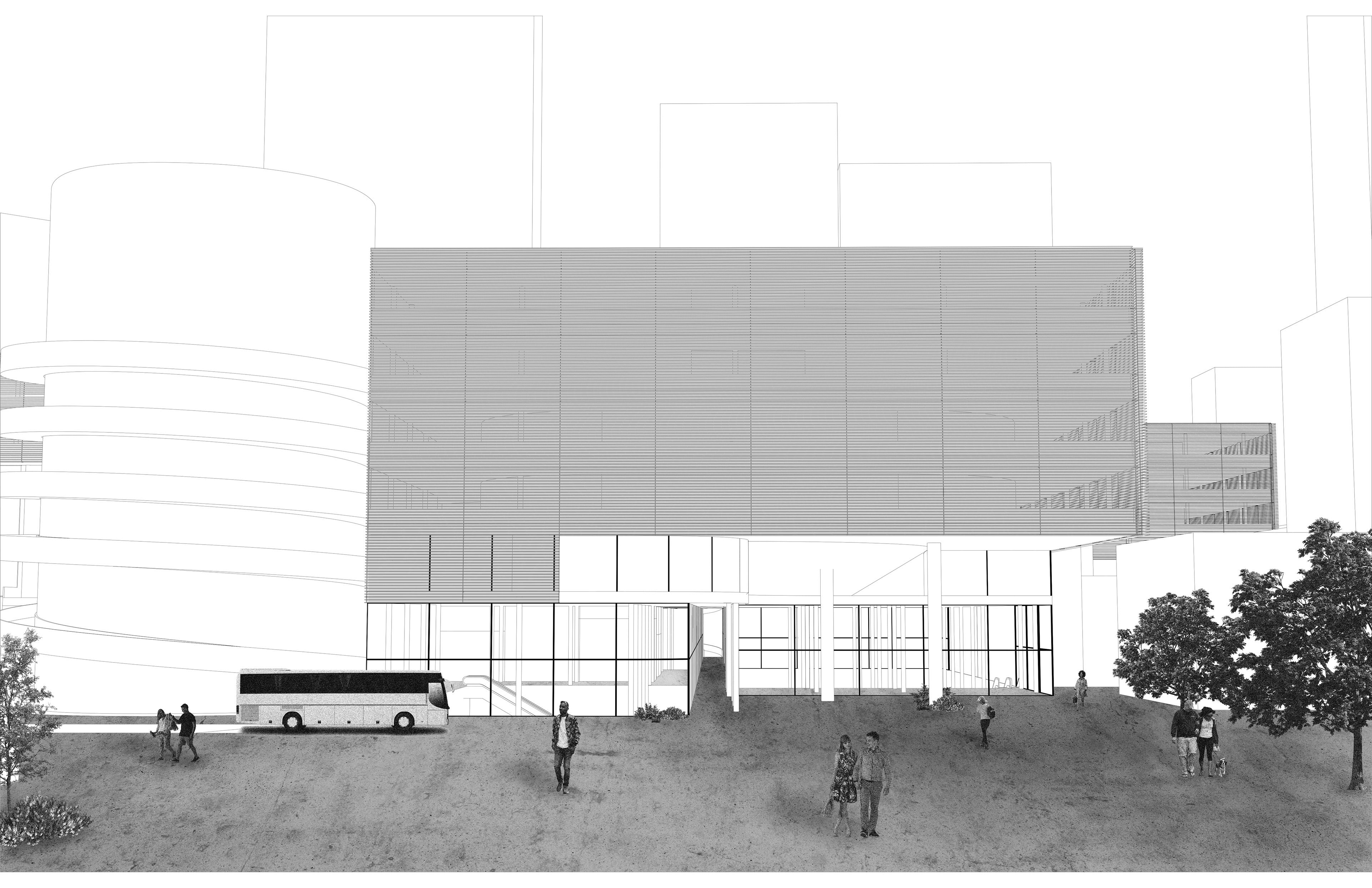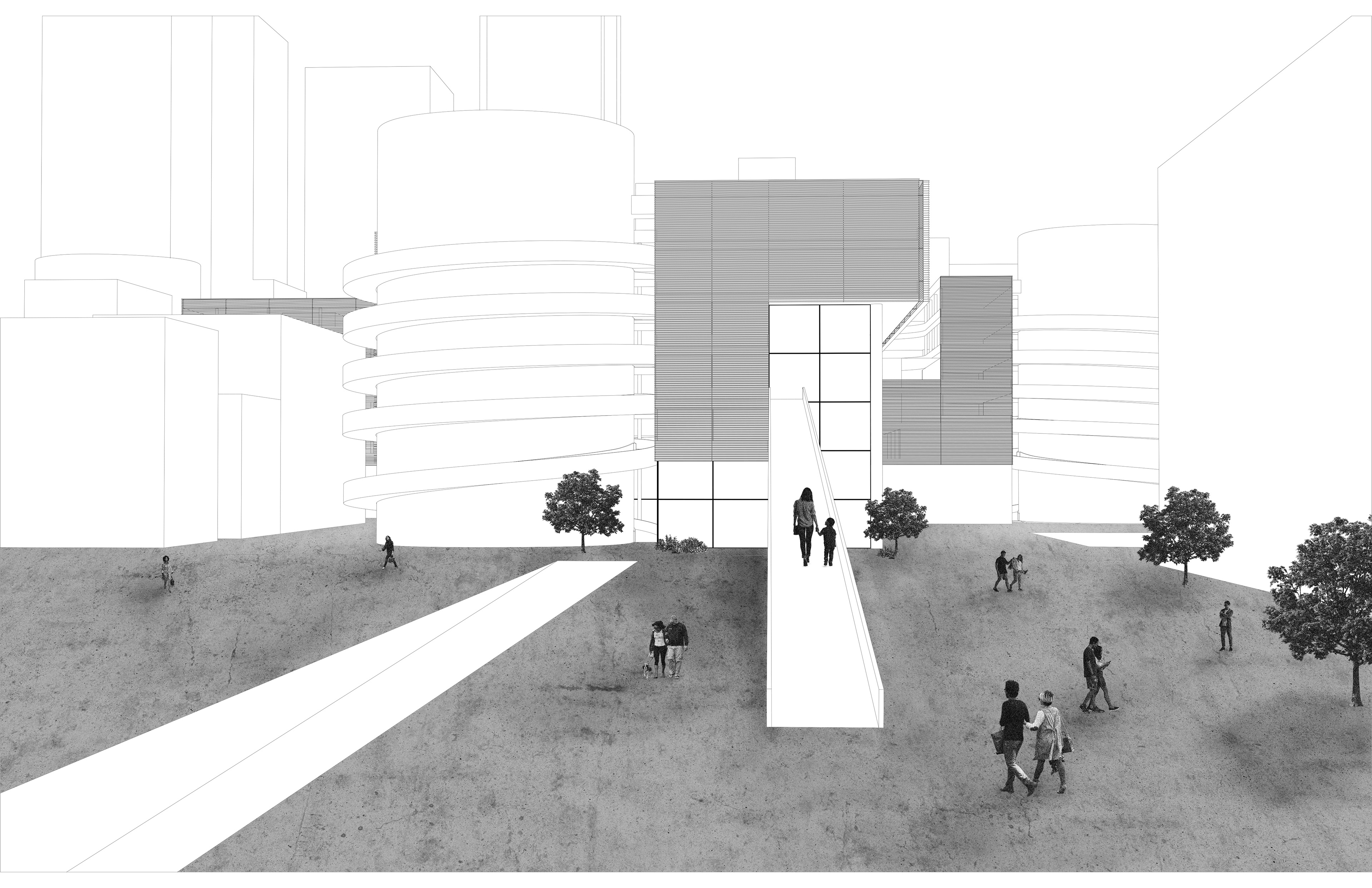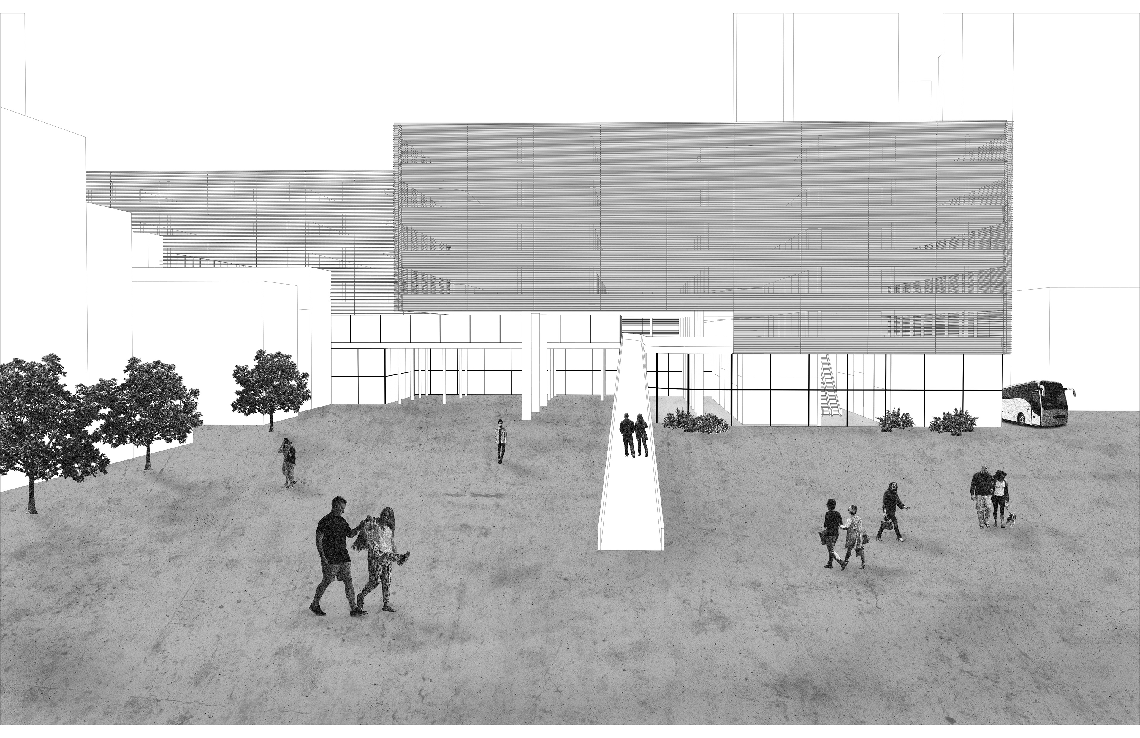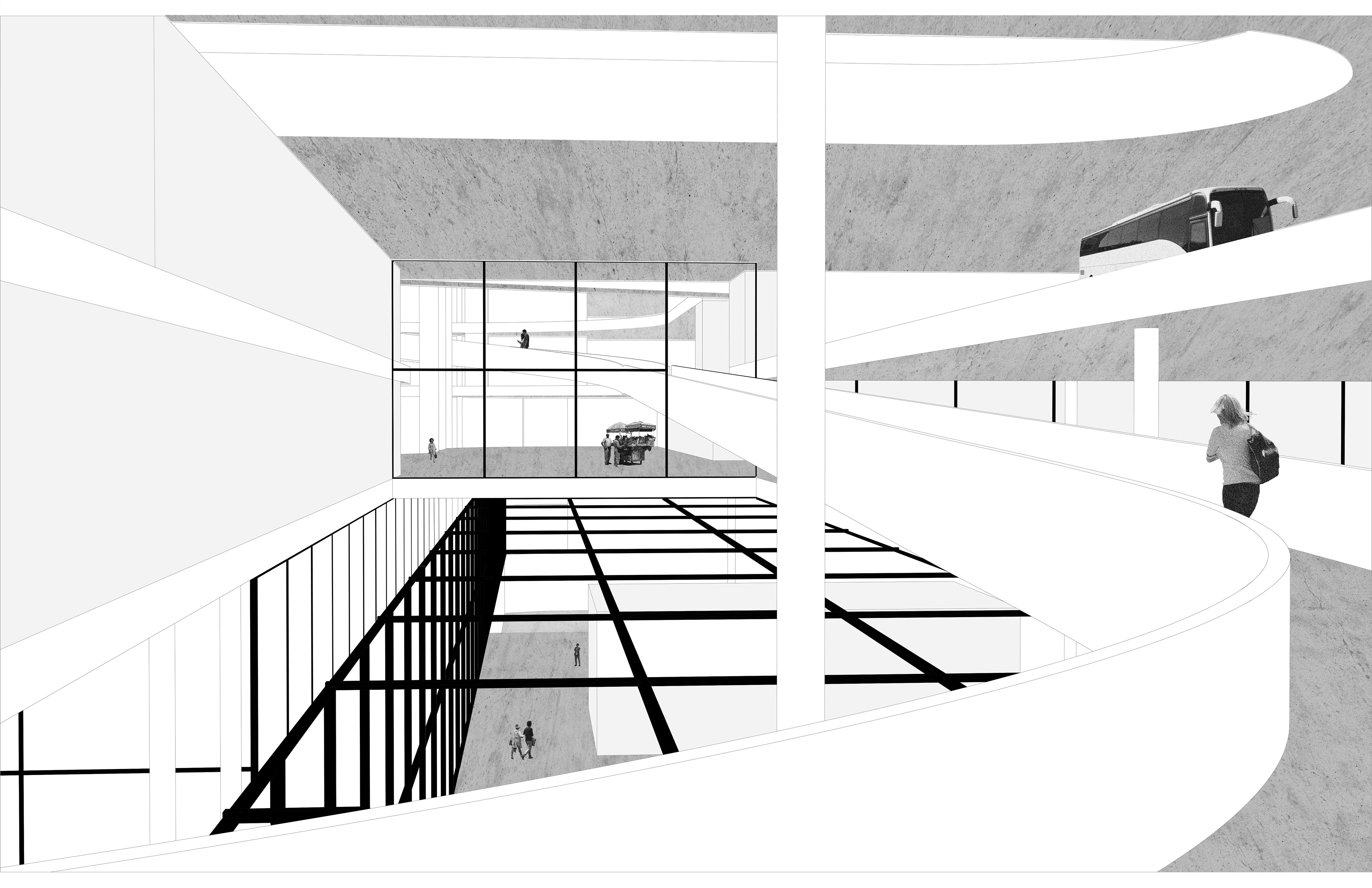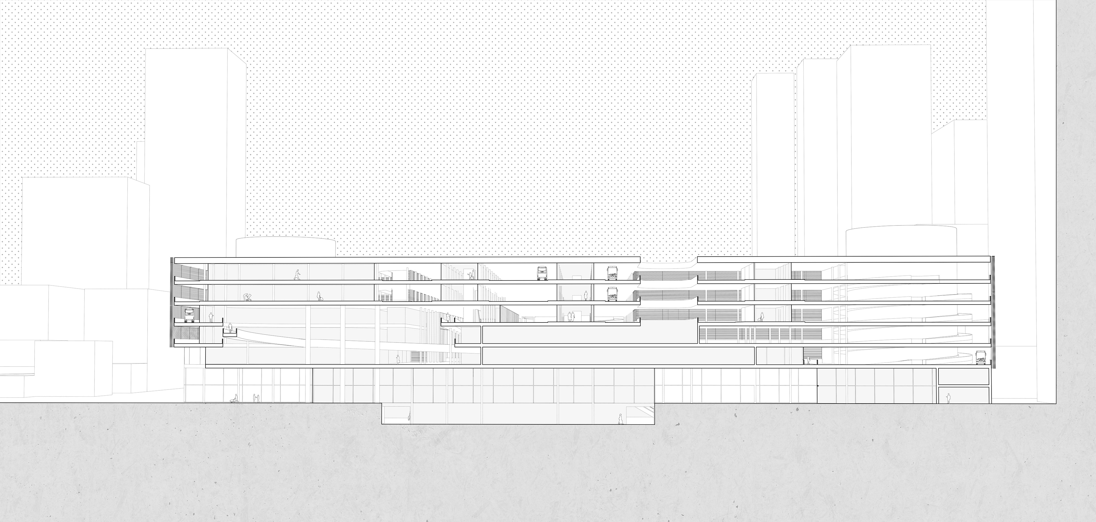 urbanistically acting as a “hinge” building, reacting to the three existing axes on the site, port authority workshops responds to the former microcosms on the site by fostering making as the secondary program. a main pedestrian ramp makes its way from the existing port authority site to hudson boulevard by weaving through the new building, carving out volumes that hold the new programs.