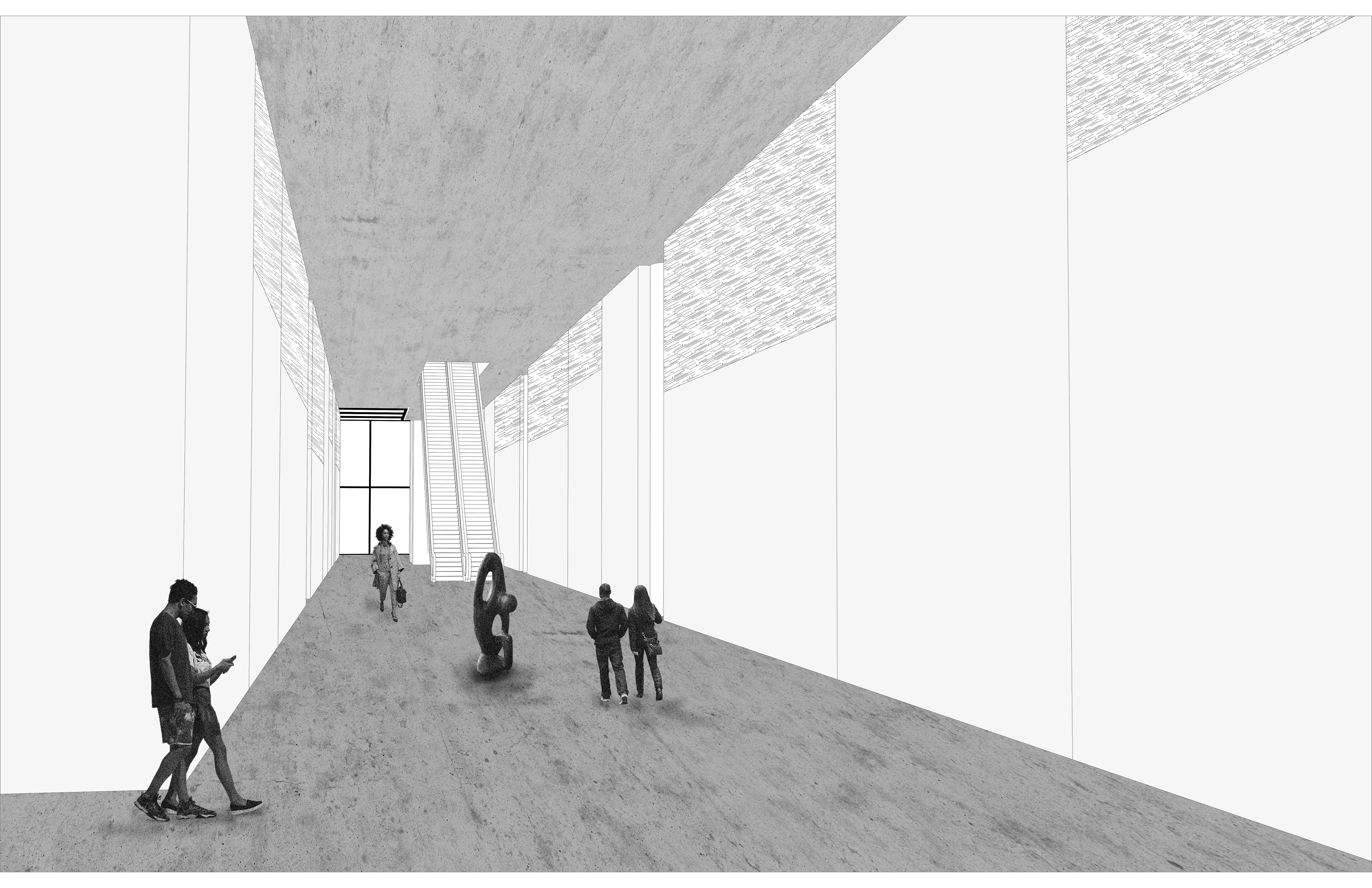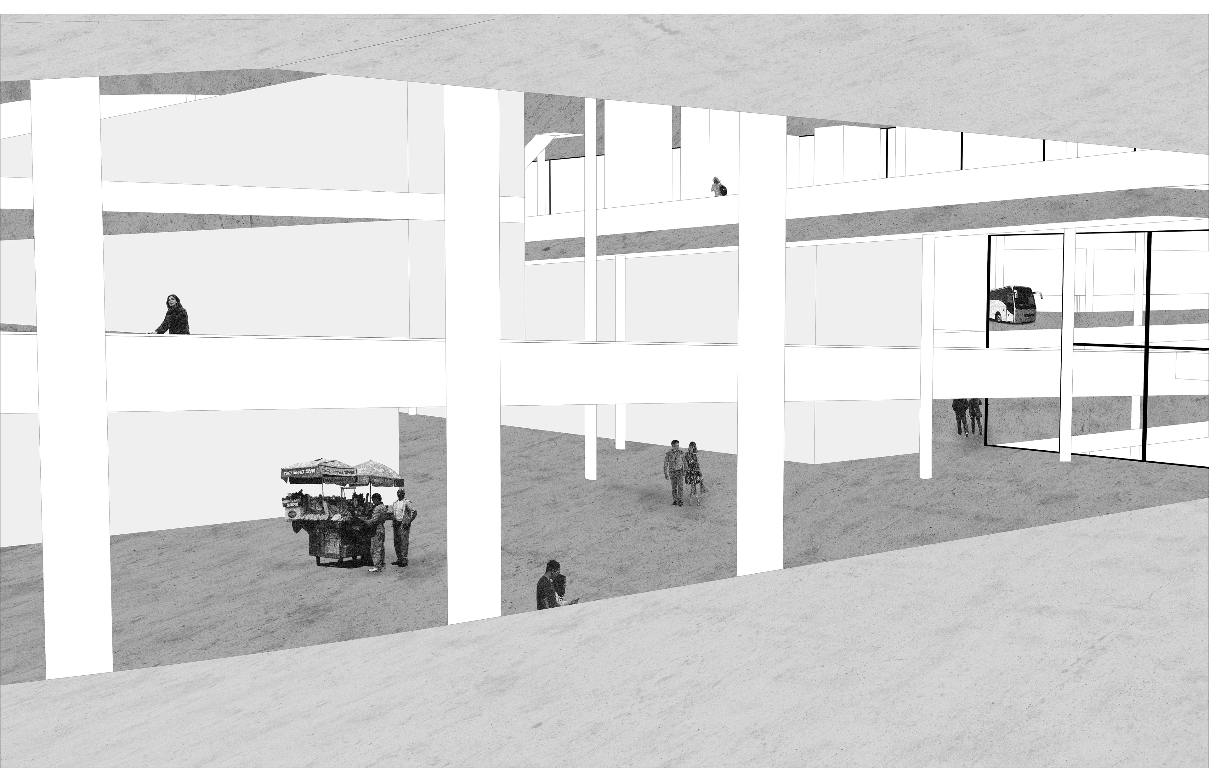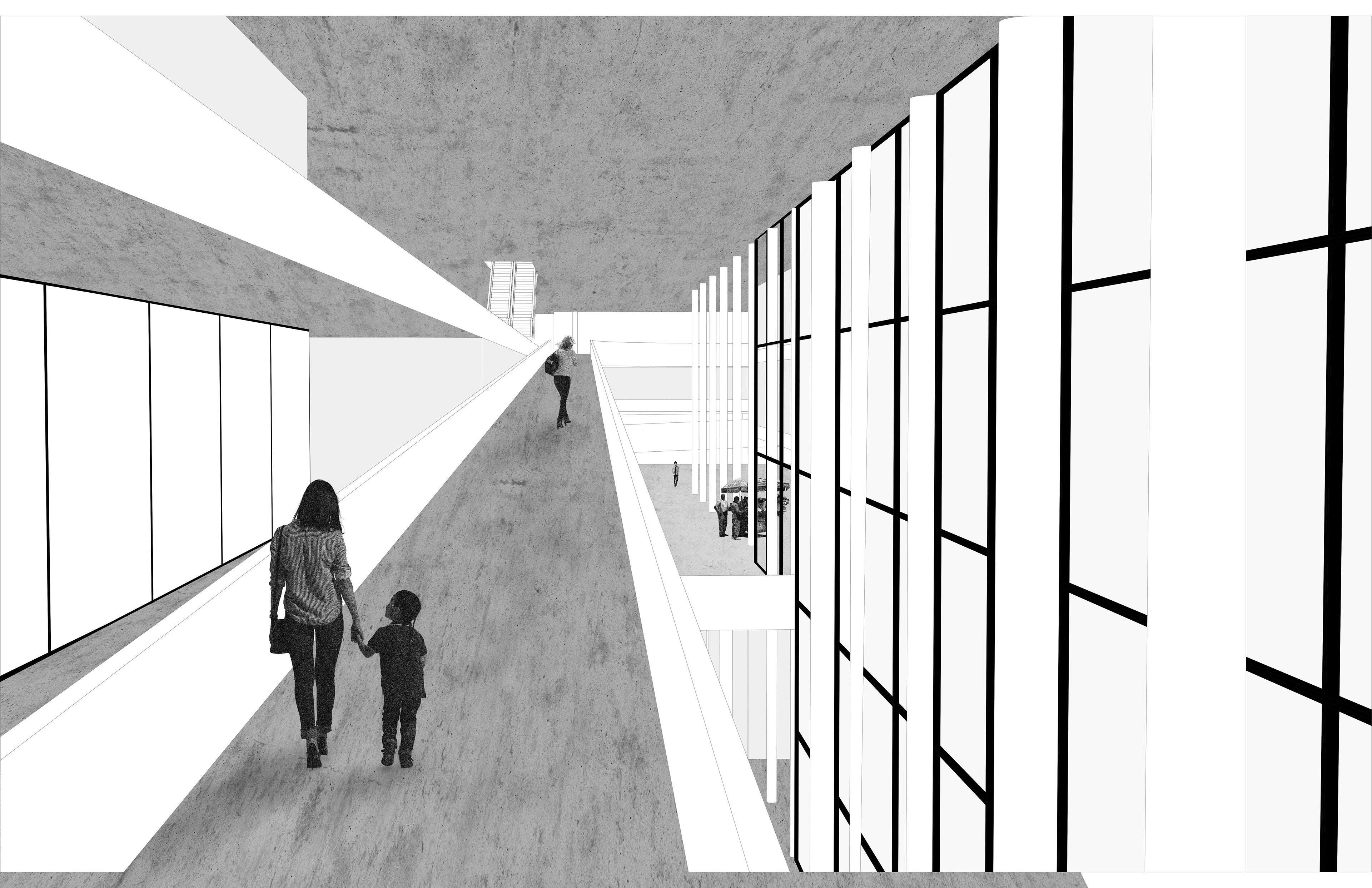the ground level becomes like a bazaar where there are streets, studios, and shops for the production and sale of various objects and artworks. larger spaces constitute a communal wood shop, metal shop, ceramic and glass studios, leather working rooms, and a mini textile mill with many looms. the port authority essentially takes on a second purpose as a hub for manufacturing and artisans that pedestrians and travelers can come to watch, interact with, and purchase pieces.