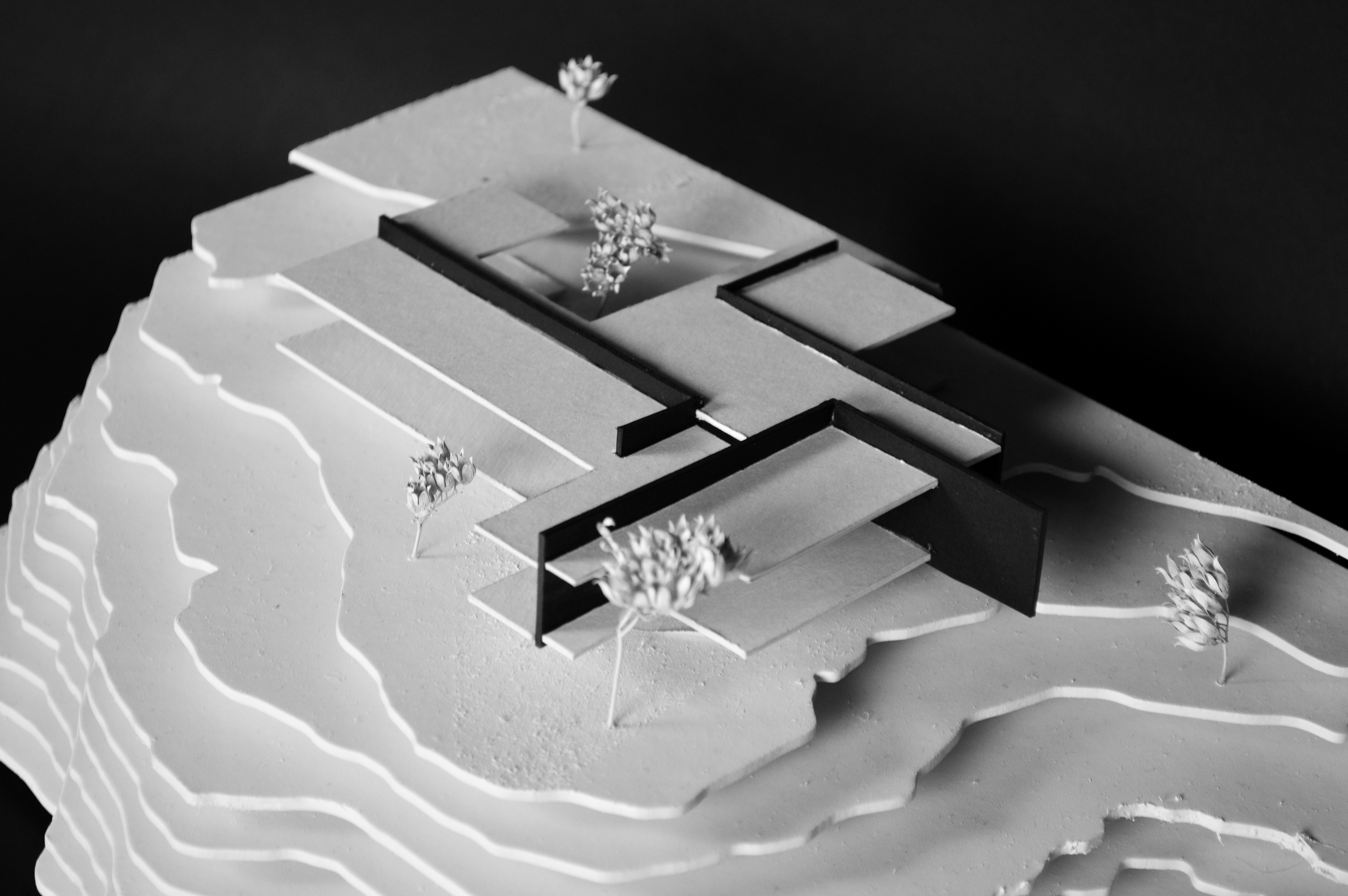 the dwelling acts as a reaction to the site. without removing the existing site conditions, the residence conforms to the location and cascades down with the changes in topography. this also relates to how the private spaces are determined. because the clients are linguists, and they love and collect books, it is these books that create the public, shared spaces, and those that are more private.